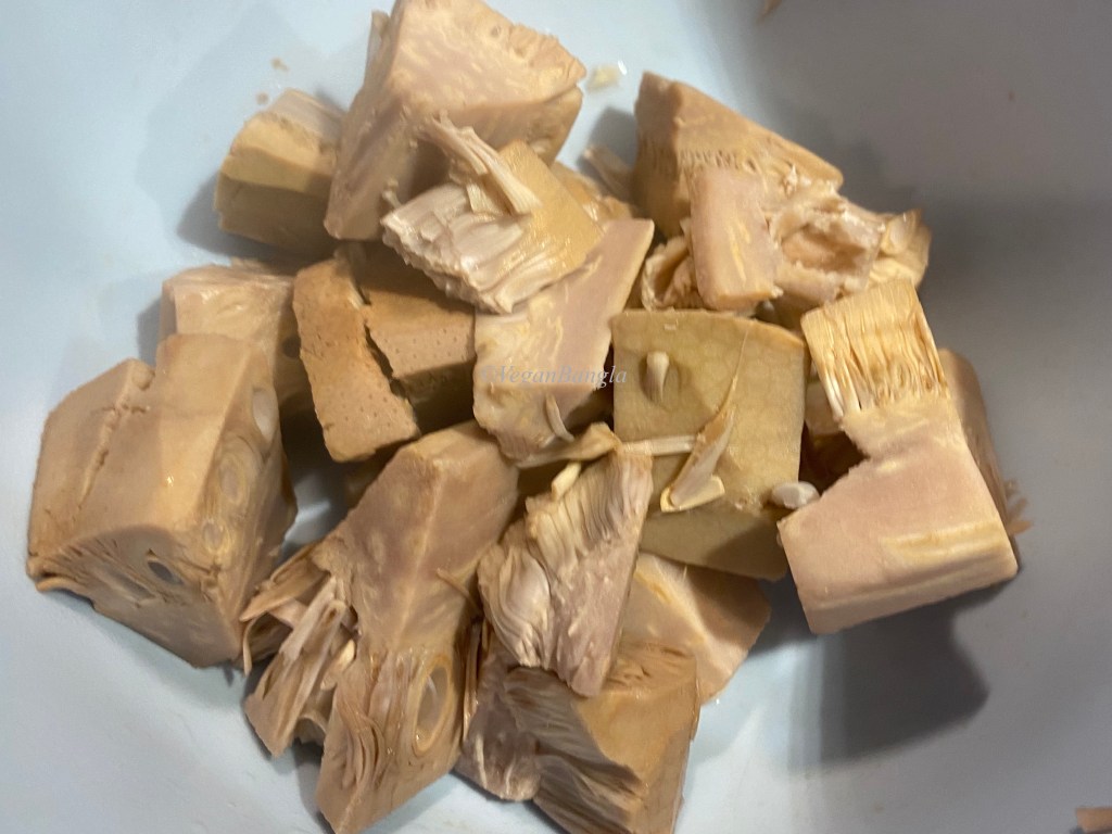 | Instruction: 1. Strain jackfruit from the canned water and boil them. After boiling strain again and pull them with fork. 2. Take a deep pan and add a table spoon of oil. As ginger garlic paste. Saute until raw flavor is gone. 3. Add dry spices-turmeric, chili, gorom moshla and cumin powder. Saute in low temperature. 4. Then add beshon or chickpea flour and cook until it releases nutty toasty flavor. 5. Add sliced onion, chopped chili and coriander leaves. Cook until they are little soft. 6. Now let the mixture get cooled for a while. 7. Rub some oil in palms and take a small amount of fruit mixture to make patty. 8. Fry them carefully both sides. Serve hot with rice or as a snack. |