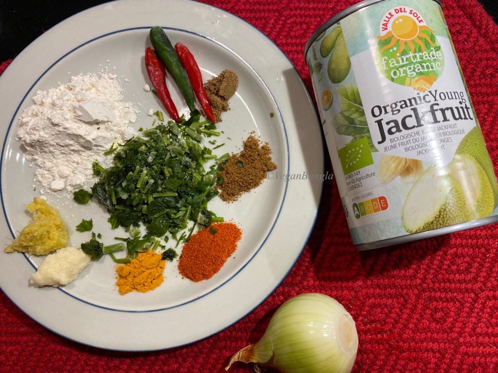| Ingredients: Green Jackfruit (Canned or fresh) Spice and Condiments: 200ml vegetable oil to fry 150-200g Gram Flour or Chick pea flour or Besan Half tsp of Turmeric powder Half tsp of Red Chili powder Half tsp of Cumin powder Half tsp of Gorom Moshla powder 1 tsp fine Salt 50g Fresh Coriander 2-3 green chili 1 onion |