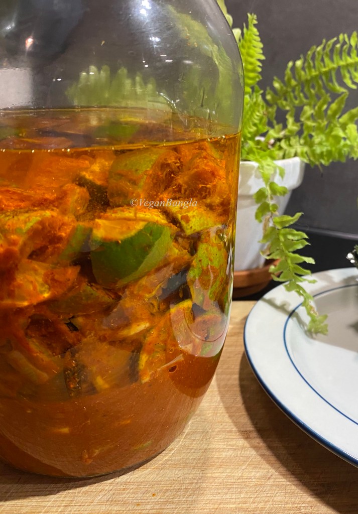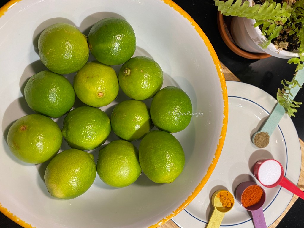 | Ingredients: 12 limes Salt – 3-4 tbsp Turmeric powder – 2 tbsp Chili powder – 4 tbsp Pach phoron – half tsp Mustard oil as needed |