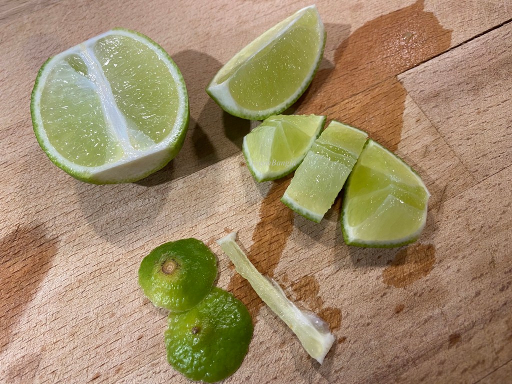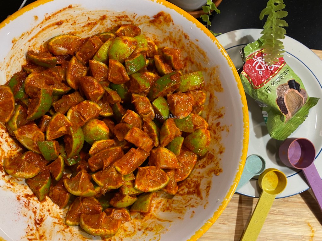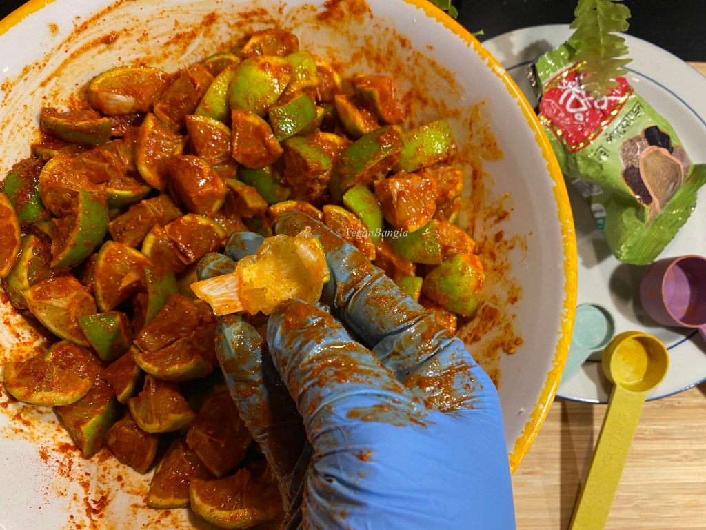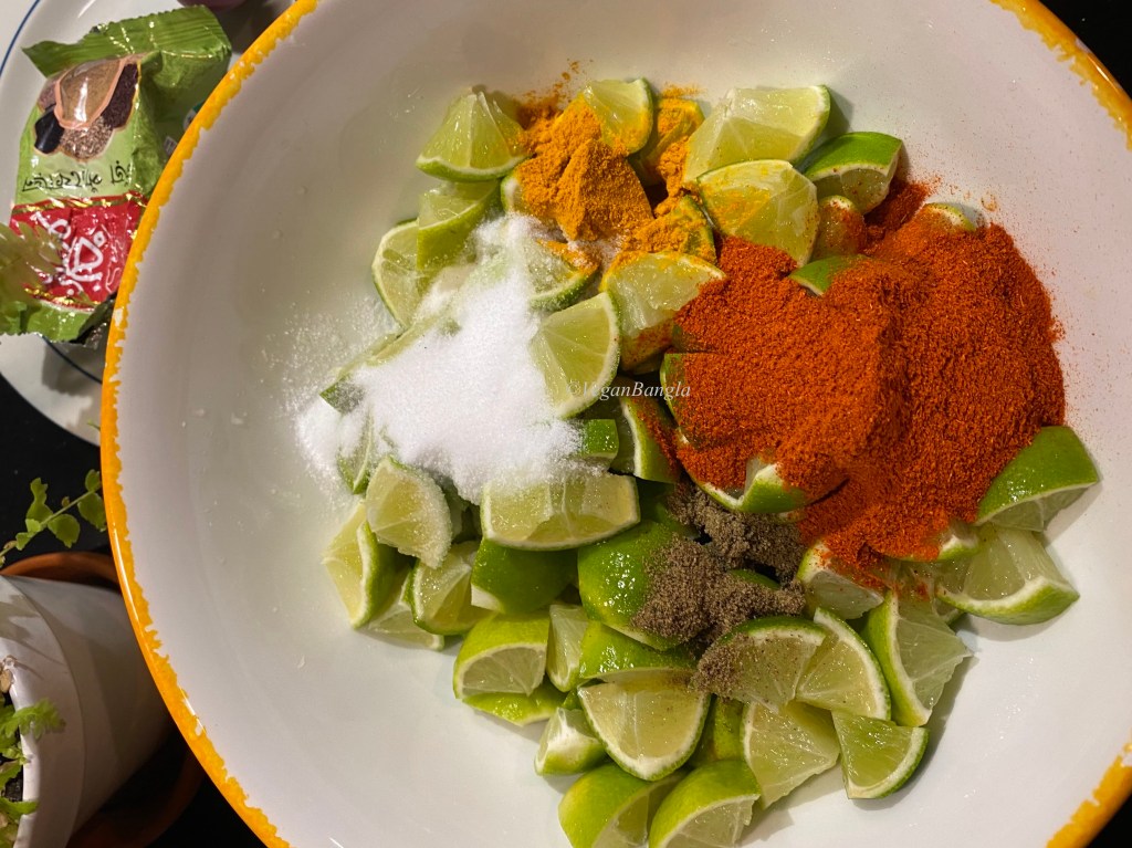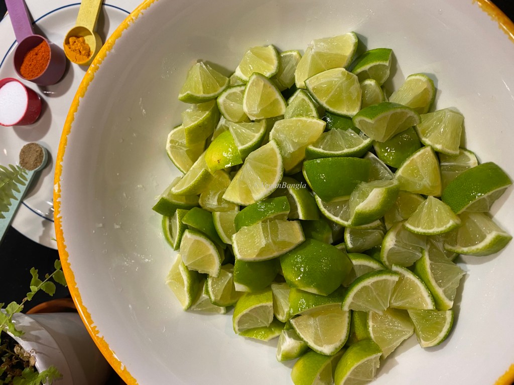 | Instruction: 1. Wash limes and pat dry them with towel, so there’s no trace of water. 2. Cut both ends of lime and then cut them in the middle lenthwise. Remove white parts and seeds. 3. Then cut lime in pieces according to your preference. 4. Put lime pieces in a glass or ceramic bowl and add all spices and salt. Rub gently. 5. Squeeze juice out of some lime. 6. Fill a glass jar with lime pieces and add mustard oil so all lime pieces are covered with oil. 7. Wait for 10-15 days before they get ready to eat. |