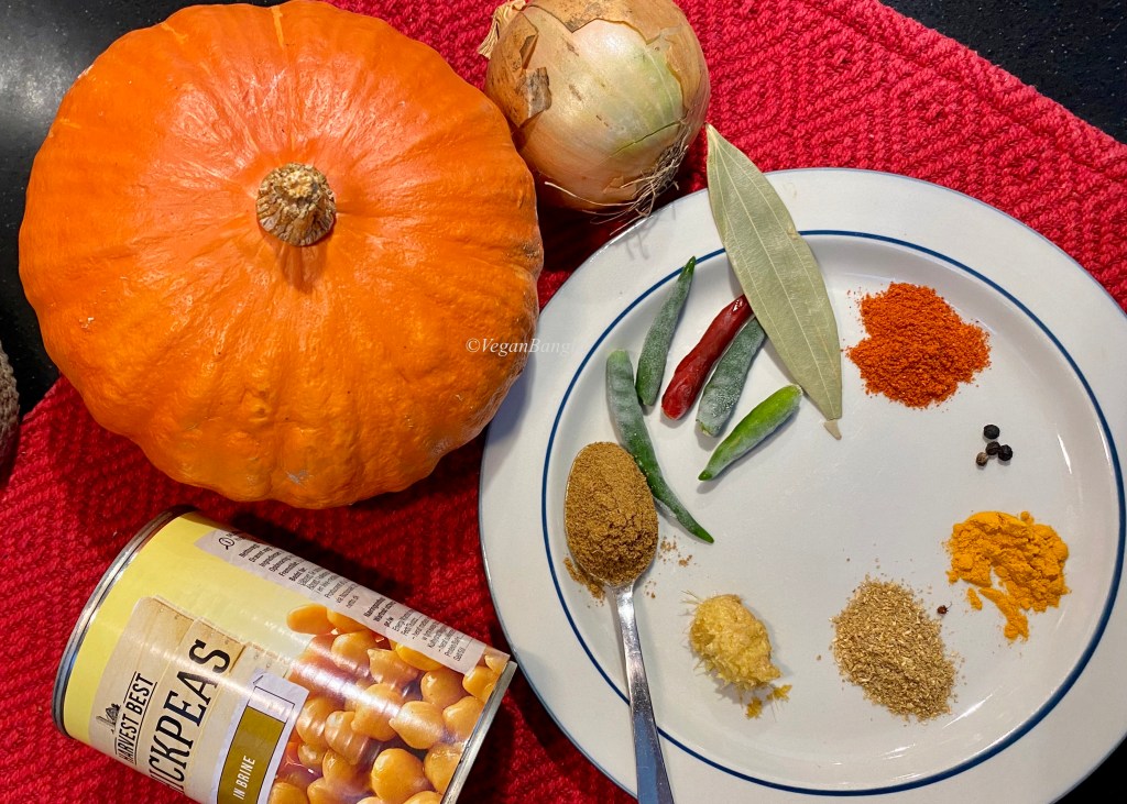 | Ingredients: 3 cup Pumpkin 1 cup Chickpea (dried and soaked or canned) Spices and condiments: 1 tsp Ginger paste 1 tsp Coriander paste/powder 1/4tsp Black pepper paste/powder 1 tsp turmeric paste/powder 1 tsp chili paste/powder 1 Bay leaf 1/2 teaspoon cumin seed 1/4 teaspoon of Turmeric powder 5 Green Chili 2 Sliced onion 2 teaspoon Cumin Powder 1/3rd Cup Vegetable oil 1teaspoon Salt |
