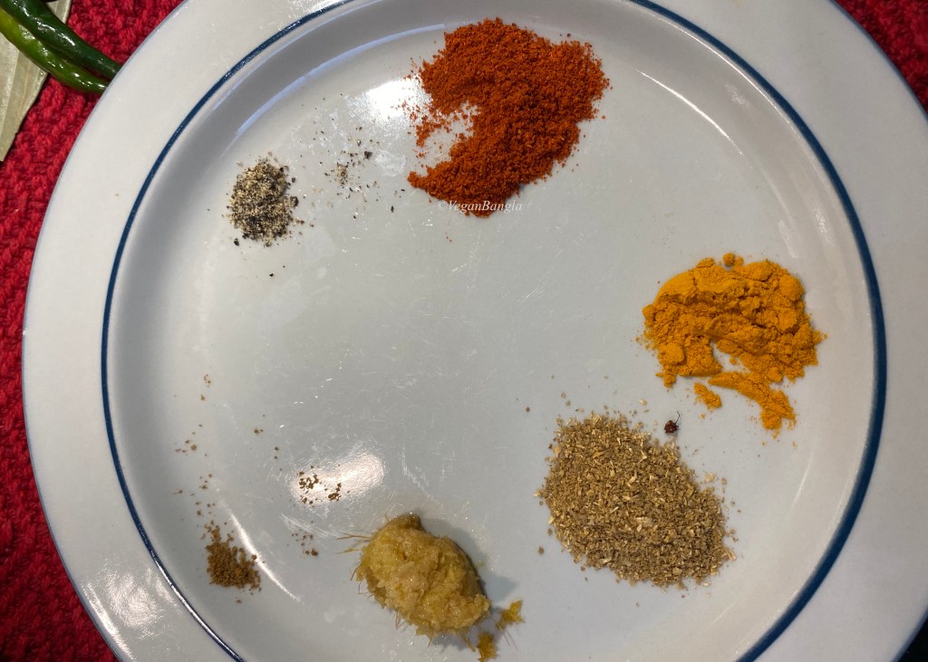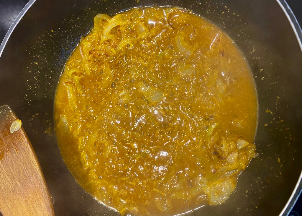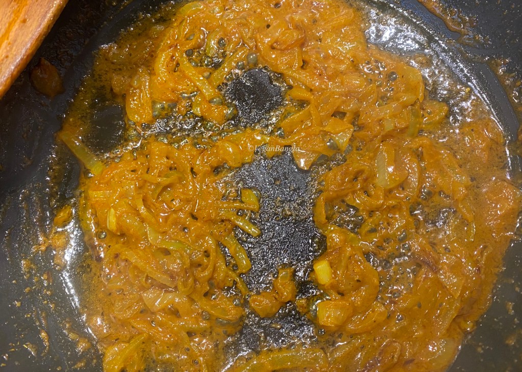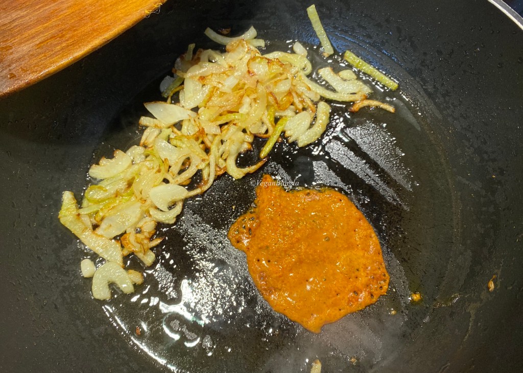 While onion being fried, I made a paste with all the dry spices and ginger paste – turmeric, chili powder, coriander and black pepper. When onion became translucent or slightly golden, I added the spice paste mix to the pan.