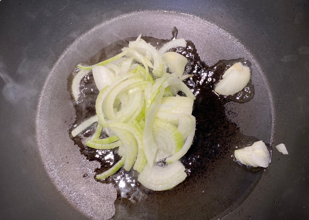 To start, fry onion in a deep wok or pan.