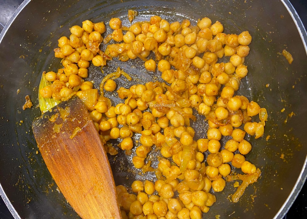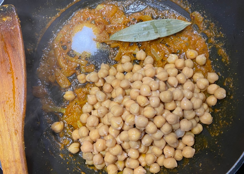Then I have added chickpea, salt and bayleaf to the pan. For this recipe I have used canned chickpea, which I drained and washed a bit before adding to pan. I stirred and fried chickpeas for four or five minutes.