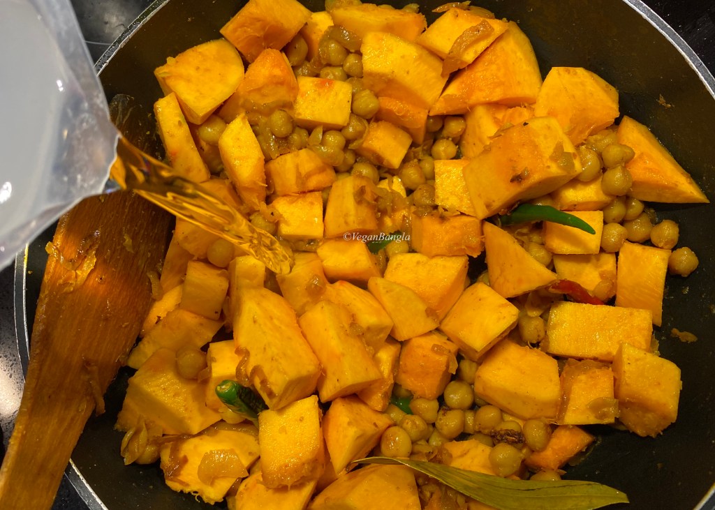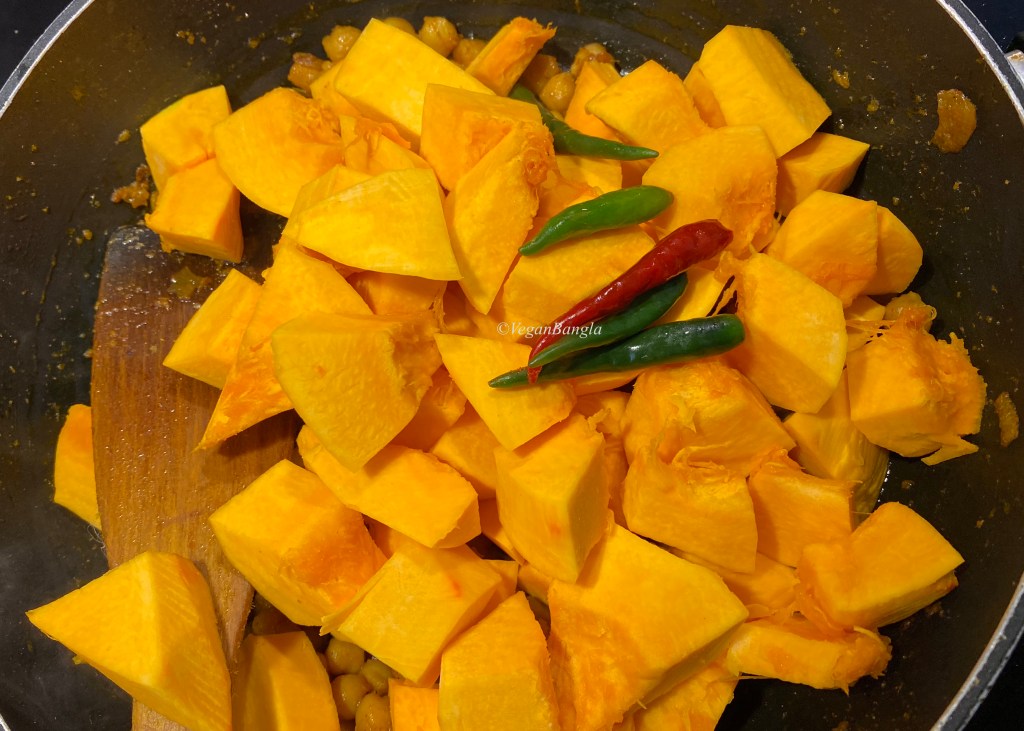 After frying chickpeas with spices for a while, I added pumpkin cut in medium chunks. I sauteed everything for a few minutes too.