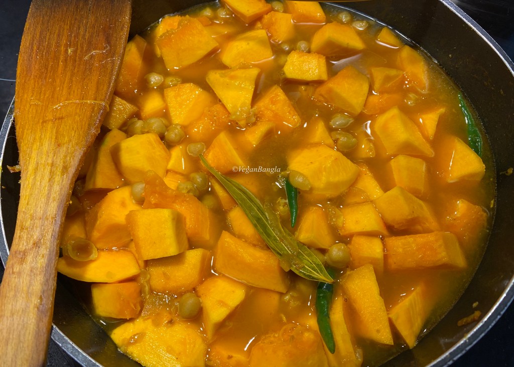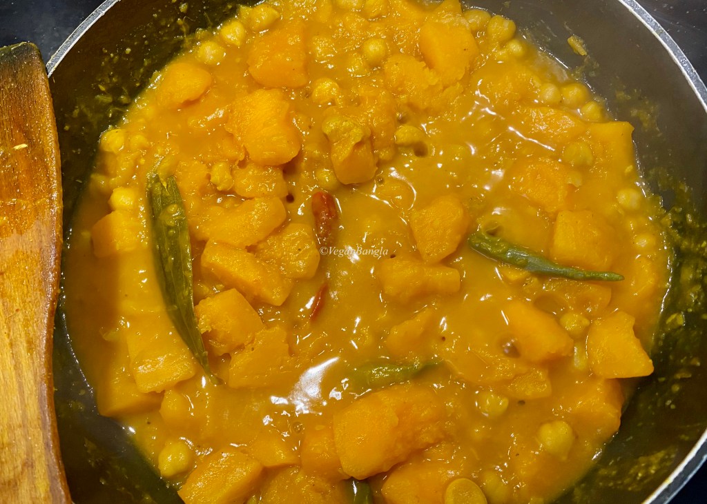 | Instruction: 1. Soak dry chickpea overnight. Wash and then boil. 2. Peel and dice the pumpkins in big square chunks. 3. Take a medium deep pan and heat oil. Add sliced onion and fry. When slightly golden, add all spices like turmeric, chili, coriander, black pepper . Add 1/2 cup of water and cook until it starts to separate oil. 4. Add chickpea, salt and bayleaf and cook for few minutes. 5. Then add pumpkin chunks and green chili. Stir and coat them well with spices and cook for five minutes. 6. Add 2-3 cups of water and cook in medium heat until pumpkin gets softened. 7. Sprinkle cumin powder to the end. When ready, serve with rice or hand made bread! |