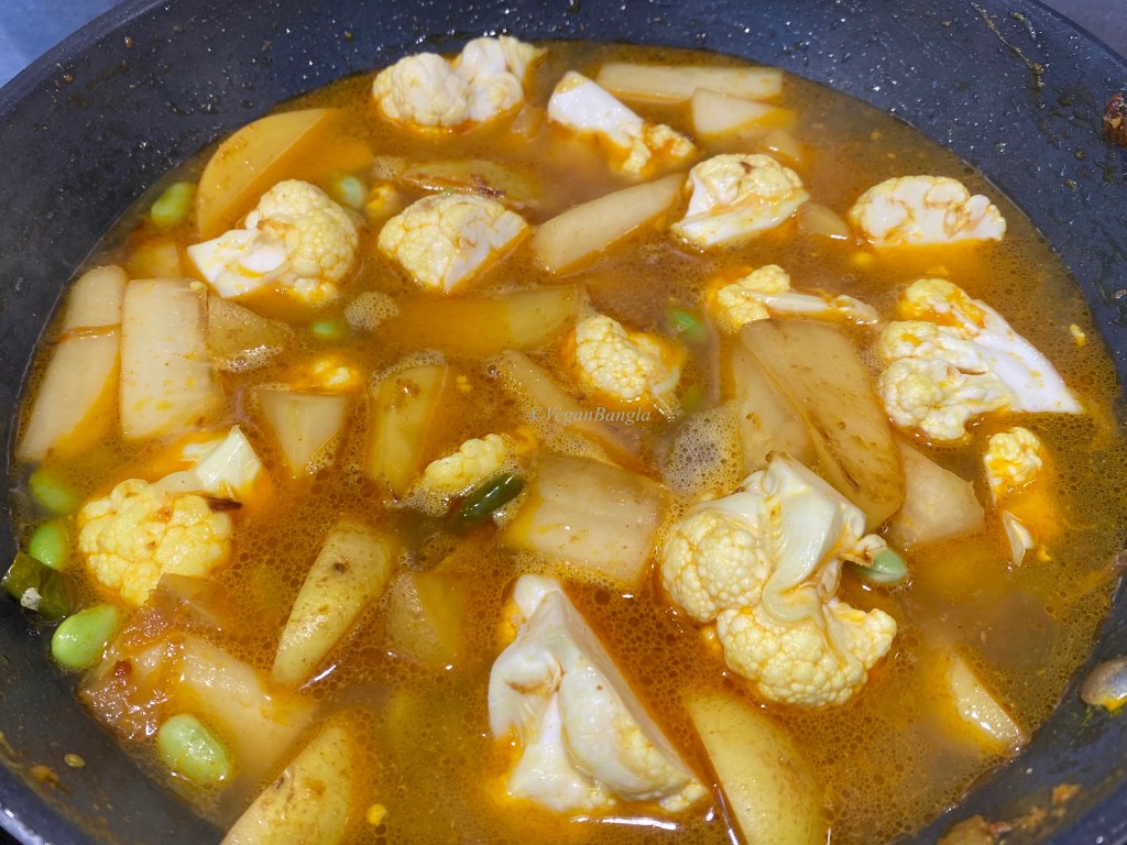 | Ingredients: Vegetables 1 Half Chinese Radish 4 Medium Potatoes half a cauliflower Edamame beans as desired Spice and Condiments 40ml Vegetable Oil 1 big onion 1tbs fine Salt 1tsp Turmeric powder 1tsp Coriander powder 1tsp Cumin powder 1tsp Chili powder 1tsp Ginger Paste (or Ginger powder) 1tsp Garlic Paste (or Garlic powder) 2-3 green Chili (optional) Fresh Coriander leaves (optional) |