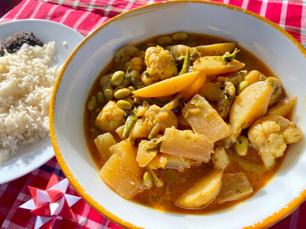 | Instruction 1. Wash and slice potatoes, cauliflowers and radish into 2cm (you can keep potato skin on if you like). 2. Heat 2 table spoon of oil in a wok or skillet. Add sliced onion and cook until golden brown. 3. Add ginger garlic paste, cumin, coriander, turmeric and chili powder to the pan and cook for 1o-15 seconds. Then add water to cook the spices until the oil floats or gets separated. 4. When spices get cooked, add potato, salt and give them a very good stir until they are mixed well with cooked spice. Stir for 5 minutes to slightly toast them. Add radish and slightly toast them in the same way for 5 more minutes. 5. Now add cauliflower and beans and just enough water to cover all veggies. Let them simmer in medium high heat til the gravy is in desired consistency. Garnish your curry with coriander leaves or ground cumin powder as per desire. and Enjoy with rice or bread! |