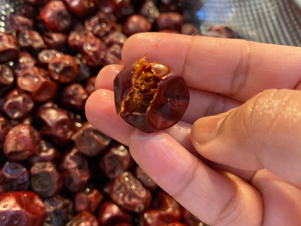 After washing and drying jujube, I pick each one of jujube and pinched a small hole. It will ensure the spices and juices to get inside of the fruit.