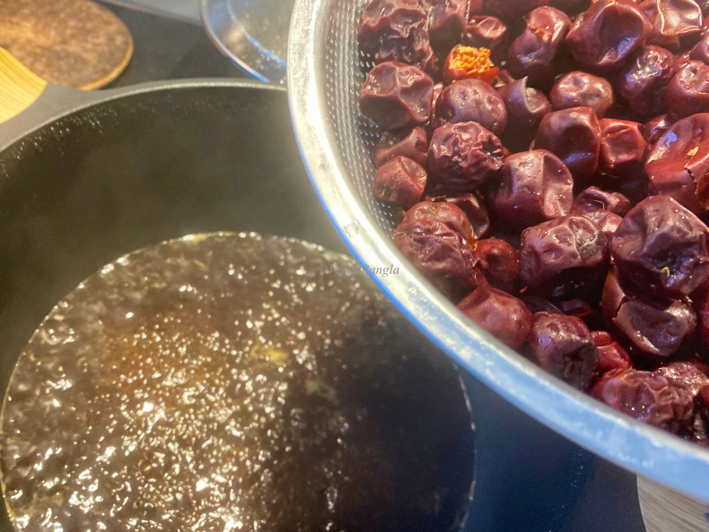 Meanwhile I added water in a pan and start melting molasses. When whole molasses melted and molasses juice started boiling, I added the jujube to the pan.