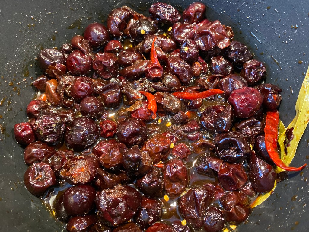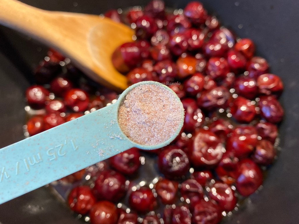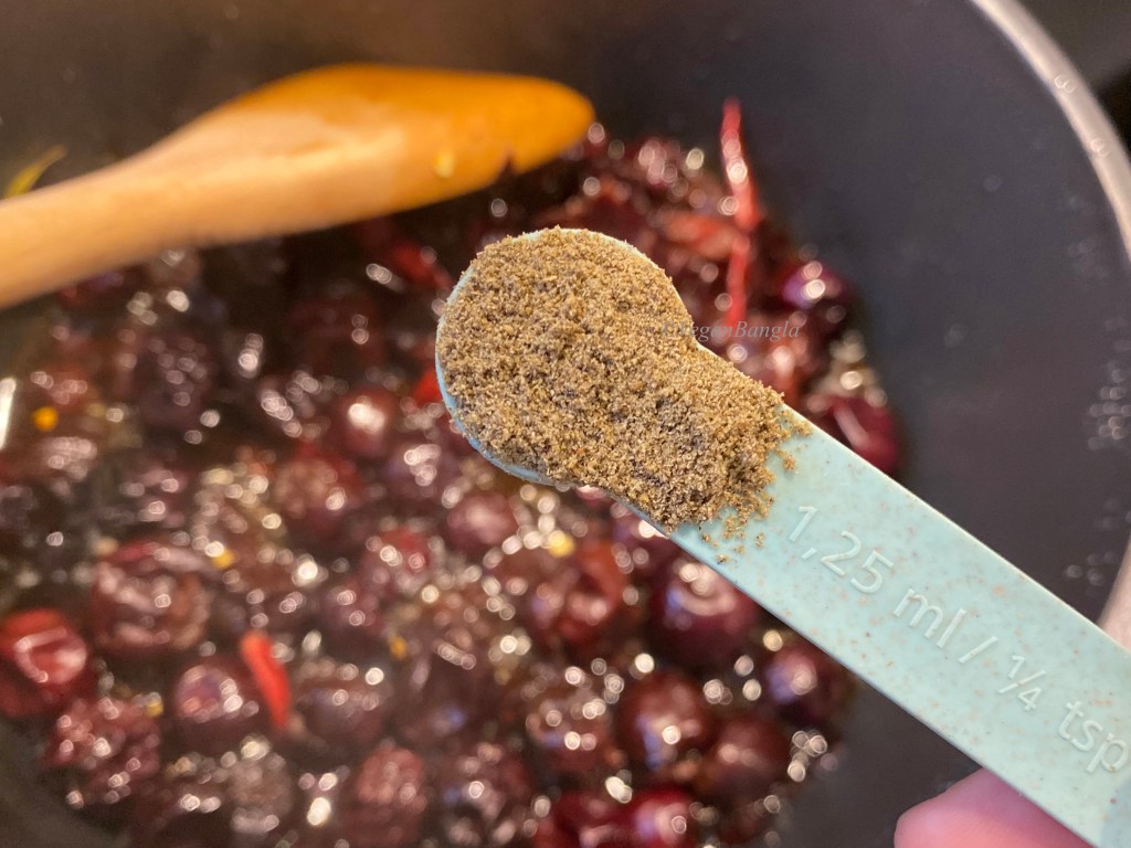 At this stage, I started adding the spices one by one – black salt, roasted pach phoron powder, bay leaf and red dry chili flakes. All ingredients were mixed well with jujube. After adding all the ingredients, it did not take much time to finish the cooking.