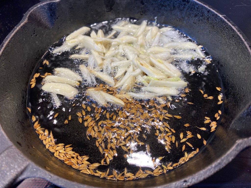 Meanwhile I started ‘bagar’ (process of sautéing onion and garlic and adding to the daal) in a separate pan. According to my in laws, adding whole cumin seed to bagar increases the taste to another level. So in hot oil I added whole cumin seeds first and added lots of garlic. Then I added sliced onion before cumin and garlic start getting browned.