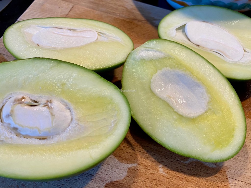 I took almost a kilo of green mango, including the skin and pit. After taking out the pit, the volume and weight decreased a bit. The other ingredients are measured per kilo, but no need to change or adjust the quantity.