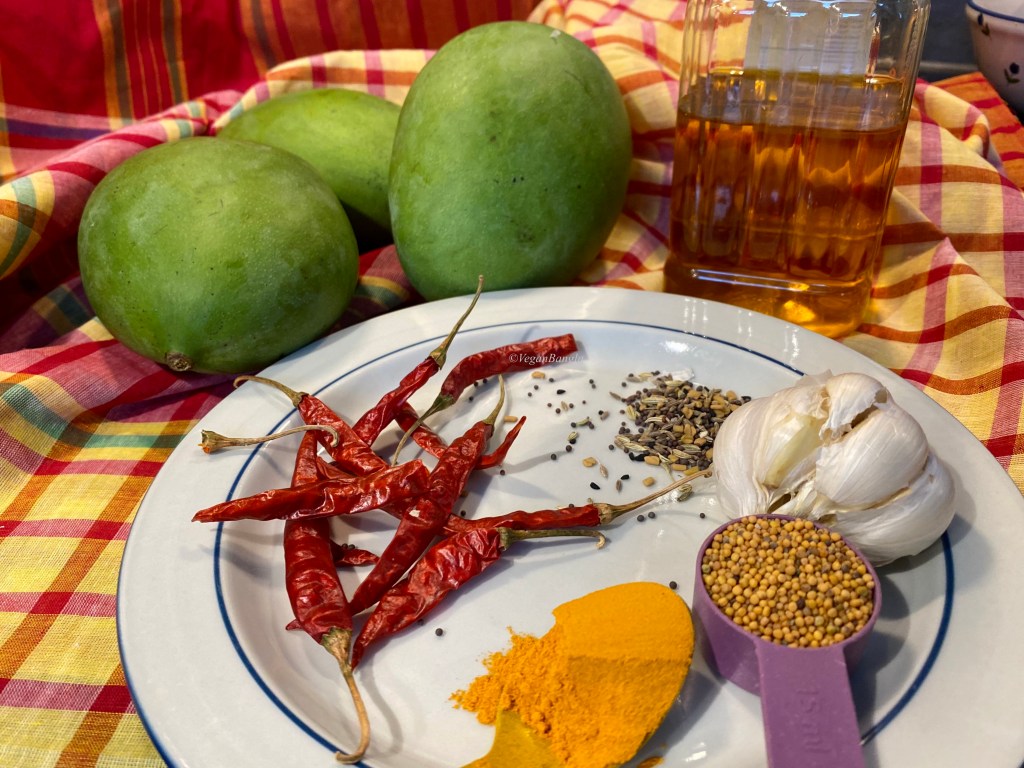 | Ingredients: Green Mango – 1 kilo Yellow Mustard seed- 1 Tbsp Garlic – 5/6 cloves Paach Phoron – 1/2 tsp Dry Red Chili – 8-10 pieces Salt as needed Mustard oil – 1 litre |