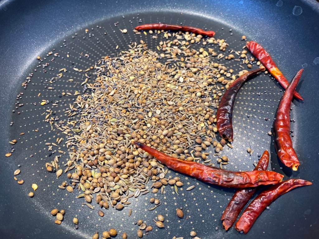 Before we start cooking, we need to toast and crush the spices first. First, take a broad pan and put on medium heat. Then add all whole cumin, coriander, paach phoron seeds and chili. Stir them continuously so they don’t get burned, otherwise they will taste bitter. When they starts to release aroma, it means they are toasted. Immediately put them in separate plate to cool them off. When cooled down, crush them coarse either with a coffee blender or mortar pestle.