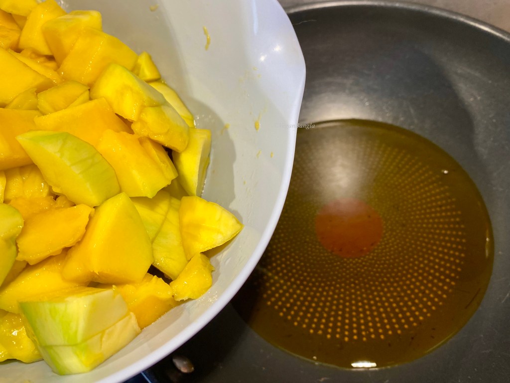 Now comes to main cooking. It will going to take a while so prepare yourself mentally. First take a wide nonstick pan (preferably wok) and heat oil in medium temperature. Then directly add diced mango to hot oil.