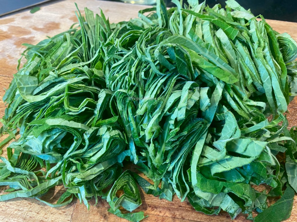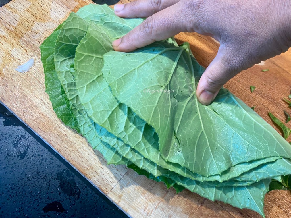 The best way to chop the leaves is the stack some same sized leaves first, fold it, cut in the middle and stack them together again and then cut like thin ribbons. This way, you can handle the big leaves like a pro and get a evenly chopped leaves, which also ensure easy cooking.