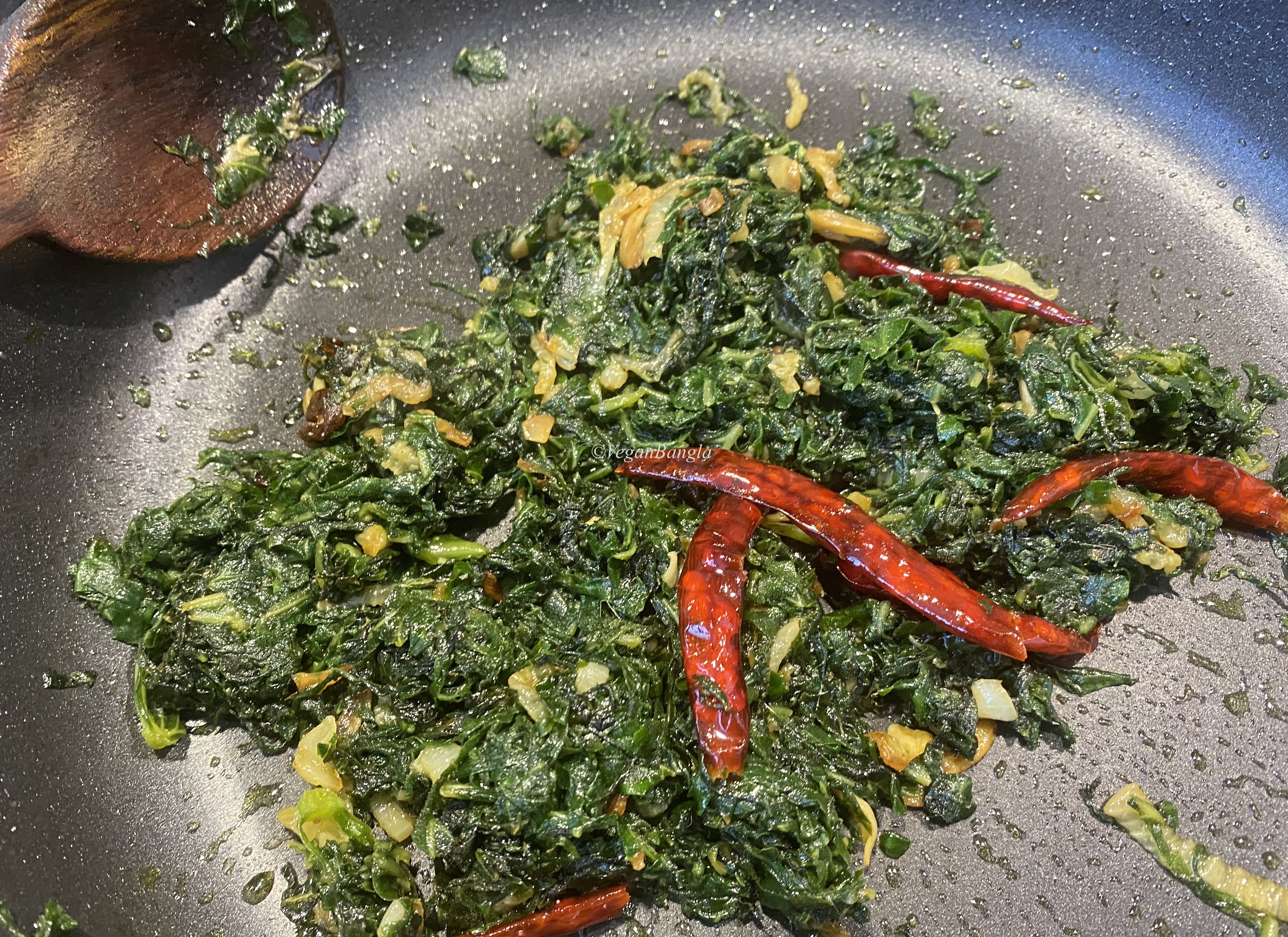 Continue to stirring leaves in medium high heat until it gets to darker in color and starts releasing oil from the side. As you can see in the photos, within few minutes the shak(leaves) would reduced much in volume and look more greeny than before.