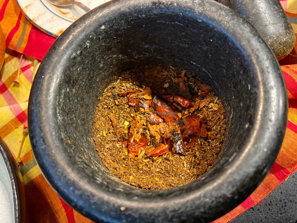 Now its time to make some pickle moshla. As usual, I heated a pan and added paach phoron and dry red chili, roasted them until fragrant and pound in mortar and pestle. I made a course ground as I like them better this way.