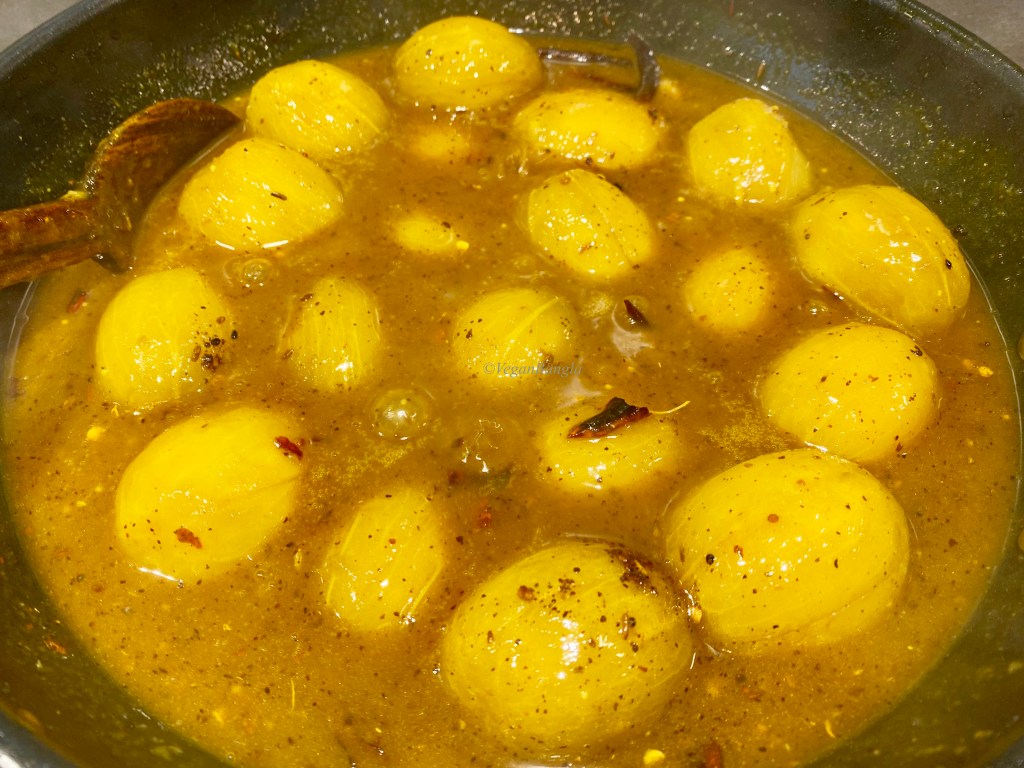 So, here’s the final look of the hogplum pickle aka Aamrar achar. The inside is still white but cooked and soft. It is best to keep them in fridge for longer shelf life. I am really glad how it turned out, as it was my first ever attempt to make hogplum pickle.