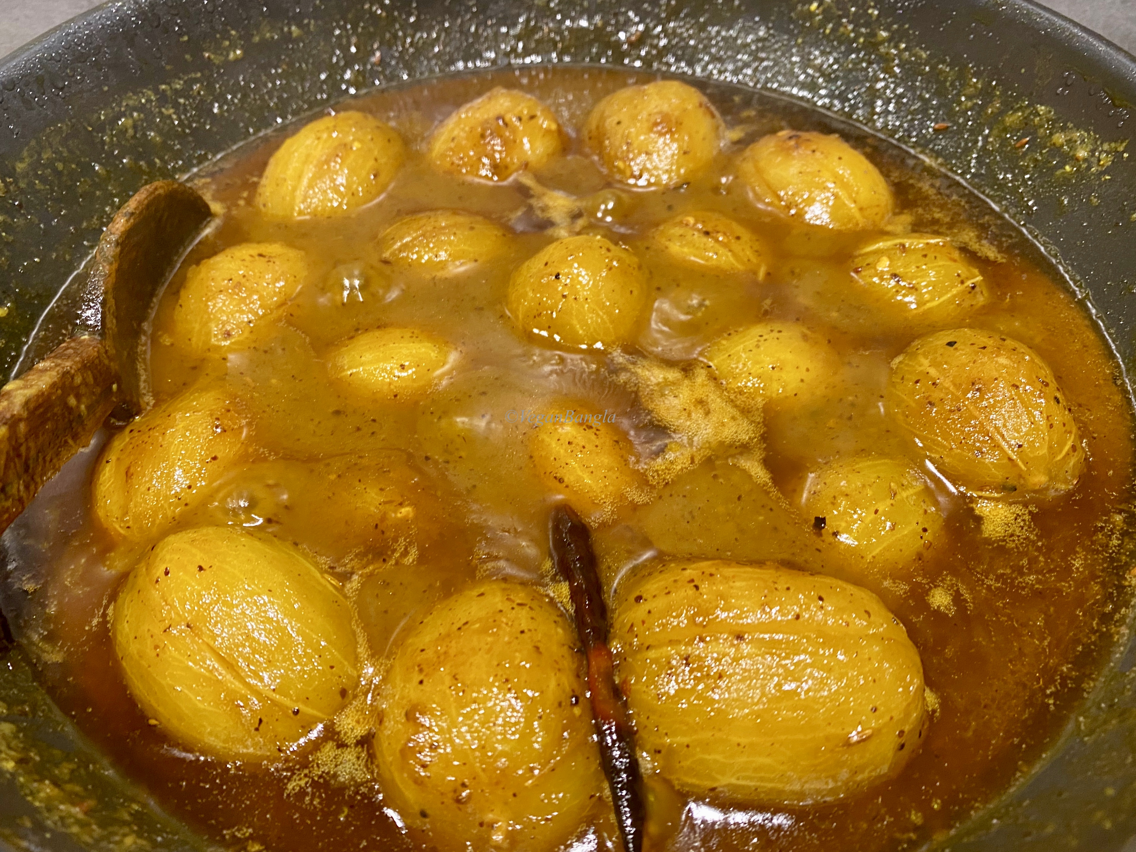 Then I addeed marinated Aamra, flipped them couple of time. They started to change colour as soon as they hit the pan.