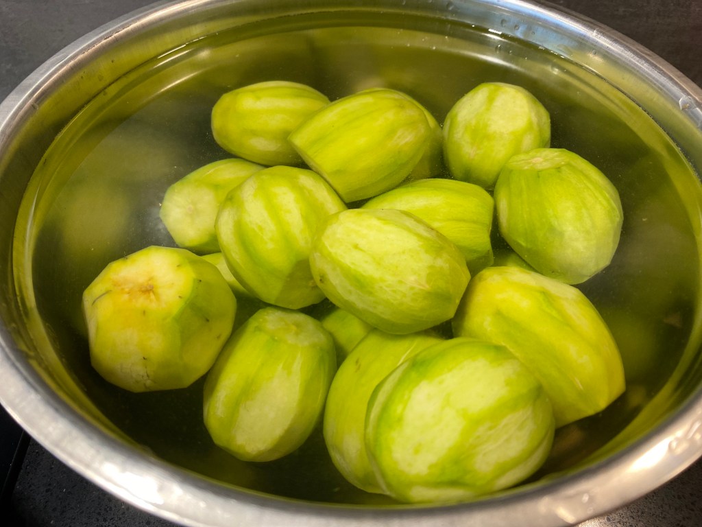 To begin with, we need to peel Aamra first and then put them in a bowl of cold water and wash thoroughly. It’s because the fruit has some tanin like substances under the skin, so washing after peeling the fruit will reduce the amount of tanin.