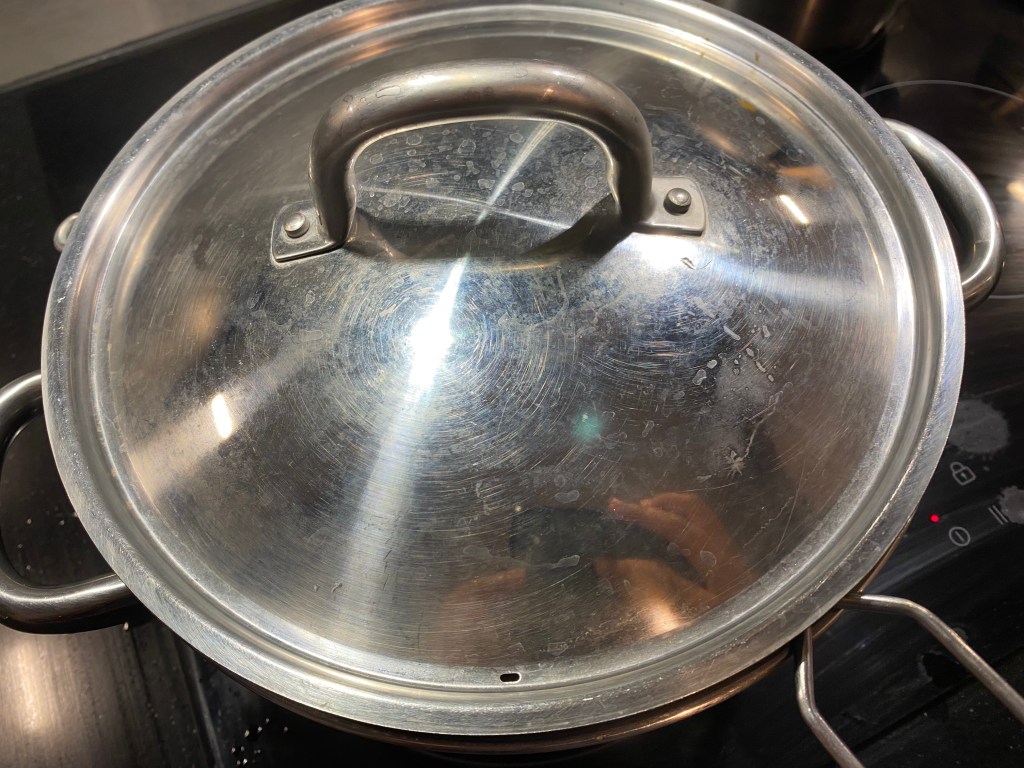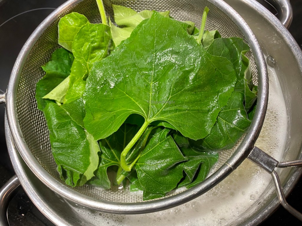 Well, there’s a special way to make this dish. According to my niece, the leaves has to be boiled/steamed with rice, otherwise the real taste won’t be there. So I was cooking rice, I put a colander on top of boiling rice, put the washed leaves on top and covered with lid.