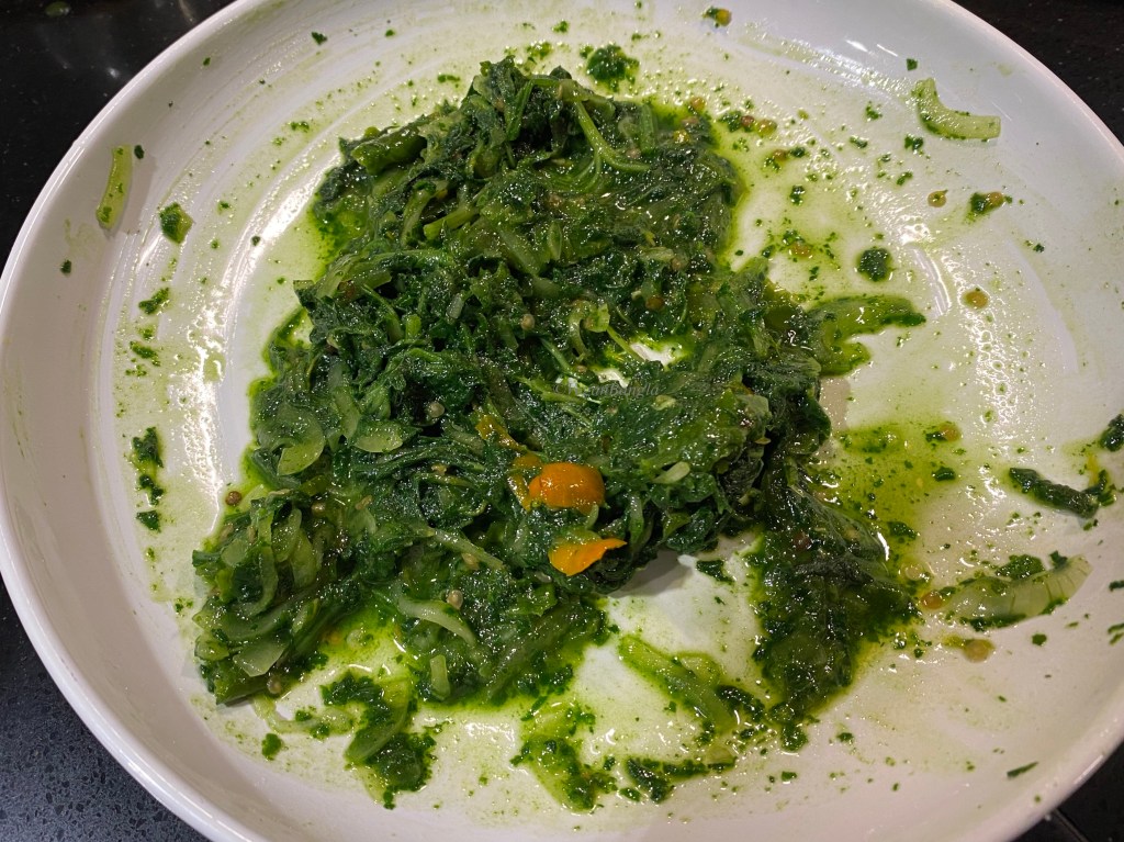 I took all the ingredients in a large plate, mashed steamed leaves, onion and chili together until they combined. Then I added a dash of mustard oil and mashed again.