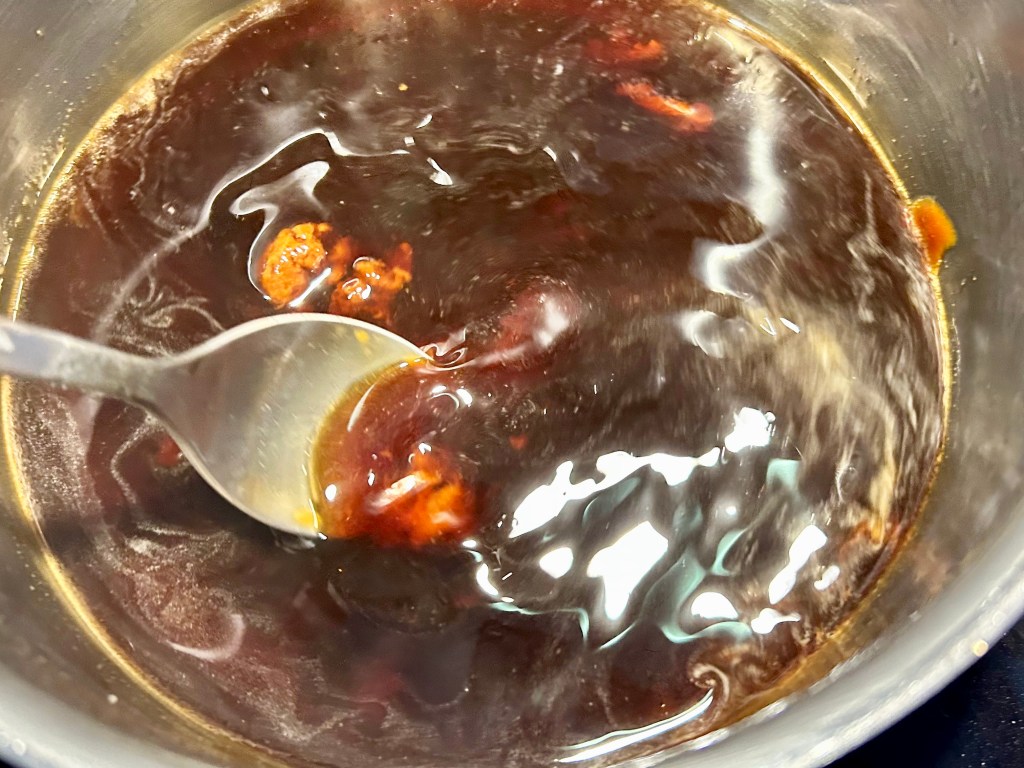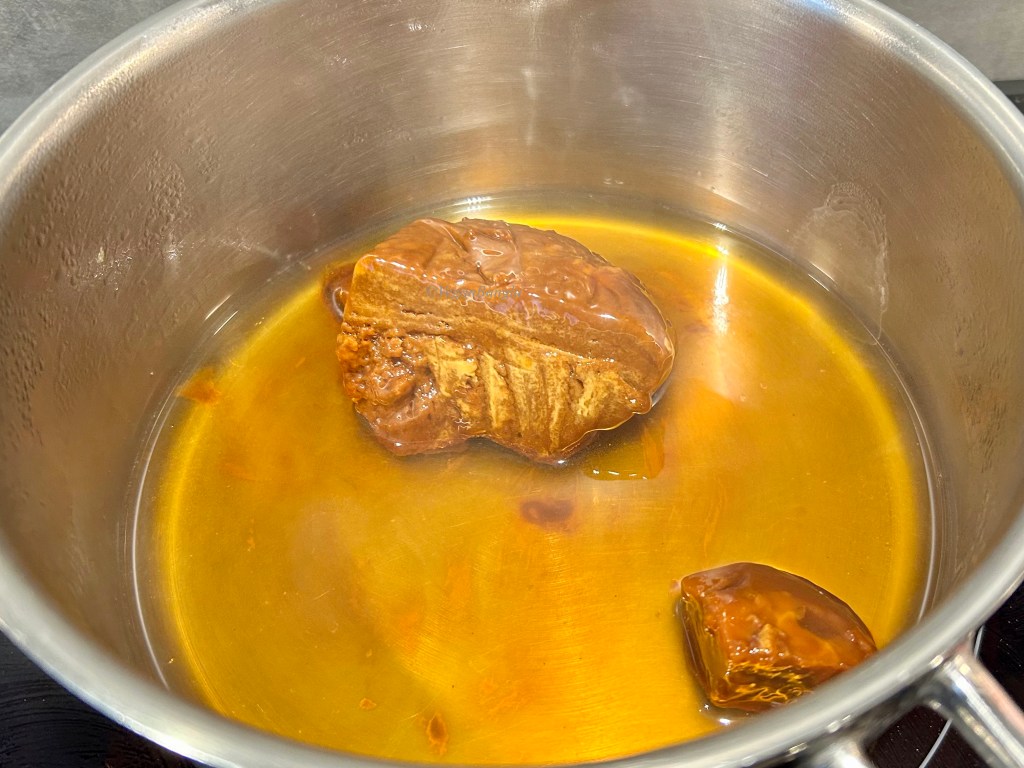 I measured all the ingredients before started making this pitha, even water too. First I heated 150ml water in a pot, when it started boiling, I turned off the heat and added jaggery to it. I stirred the jaggery until all of them are completely dissolved.