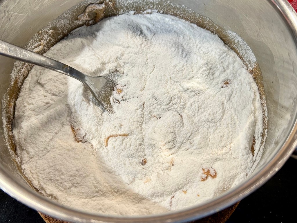 Now I have added the wheat flour to the batter, I looked like it needed more water so I added little cold water at a time. Until the batter looked thick but runny, I kept adding cold water. Remember to add only cold water when the batter has wheat flour in it.