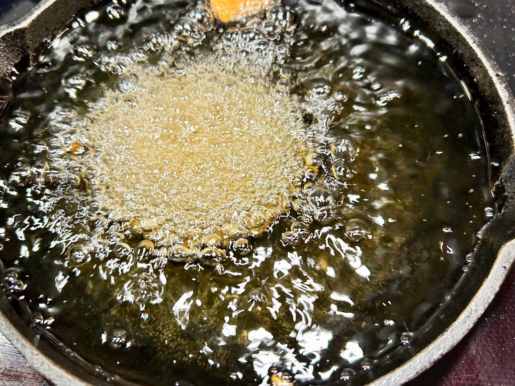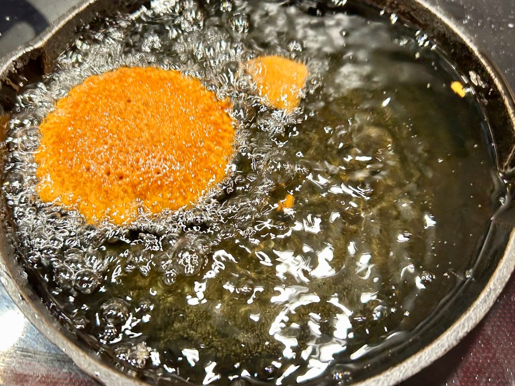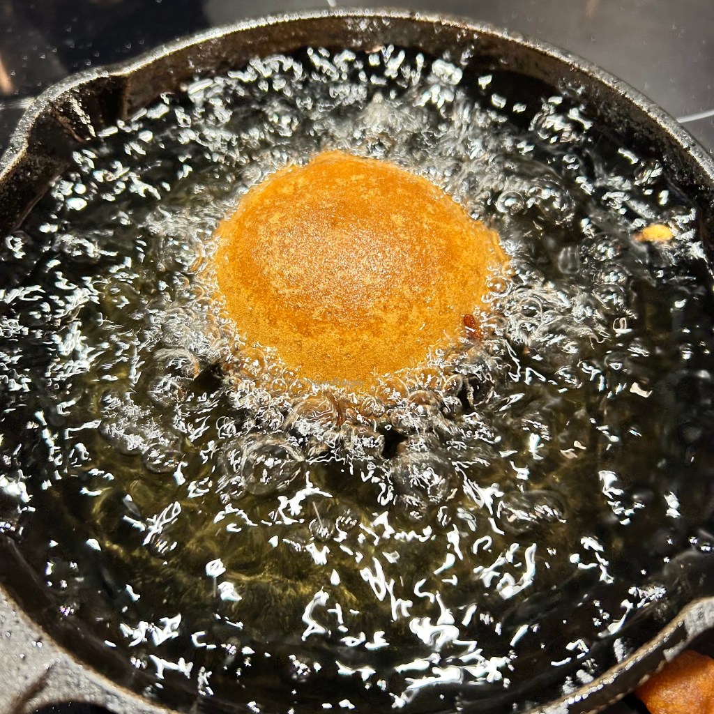 Then I a pot I added oil and heated to medium to low heat. When oil got warm enough, I added the first scoop of batter directly to the oil.