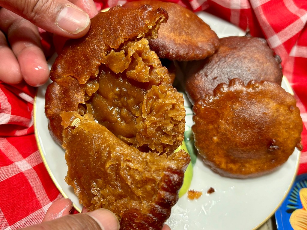 | 1. Dissolve jaggary in very hot water. Add rice flour to dissolved jaggery and rest the batter for 30mins. 2. After 30mins, add wheat flour. If needed add cold water to the batter. The batter needs to be thick but runny. Add salt. 3. In a cast iron pan (which has been used a lot), warm oil in a medium -low heat. 4. Use a ladle to scoop the batter and put it hot oil. Once half done, the pitha should be floating self. After floating, flip the pitha and fry for 1 more minute. 5. Use paper towel to soak extra oil. Don’t crowd two pitha at a time. Enjoy Poa Pitha with Bangladeshi Cha/tea in the evening. |