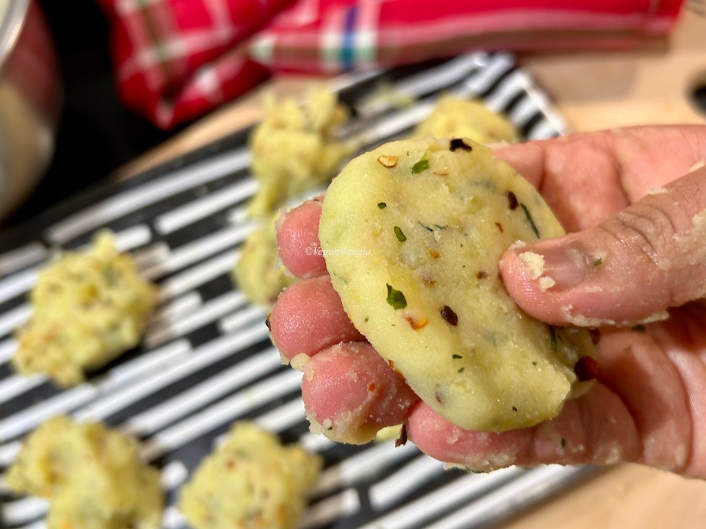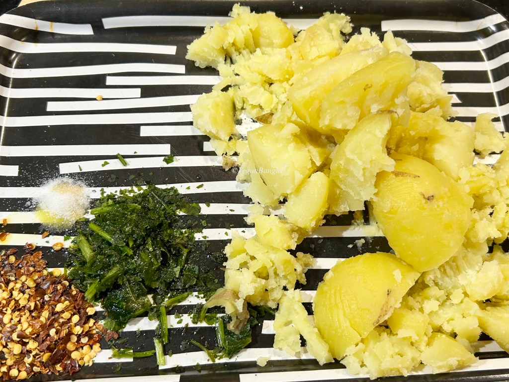 | Ingredients: For filling- 3 medium potatoes 1 tsp Chili flakes 1/2tsp salt fresh coriander leaves onion sliced (optional) For batter- 1/4 Cup Beshon(chickpea flour) 1tsp Wheat flour 1/4 tsp salt 1/4 tsp oil 1/2 tsp baking powder Cold water |