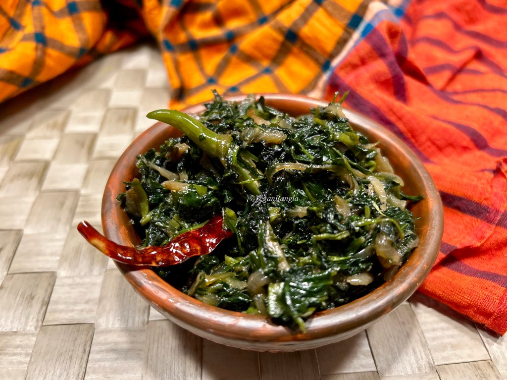 | 1. Discard the bottom part of the leaves, and keep the top until first two nodes. Wash all leaves, thoroughly with cold water, discard old parts. 2. Chop leaves roughly. 3. In a pan, heat oil and add dried red chili, sliced onion and garlic. Fry them until onion garlic are golden brown. 4. Add chopped leaves and continue to stir them until shrunk. 5. When all leaves gets smaller volume, add salt. 6. Add green chilis when leaves releases water. Continue stirring until water get evaporated and oils get released in the pan. When done, put in a serving bowl. Serve with rice. Enjoy! |