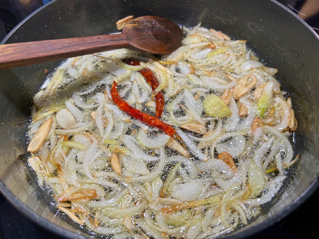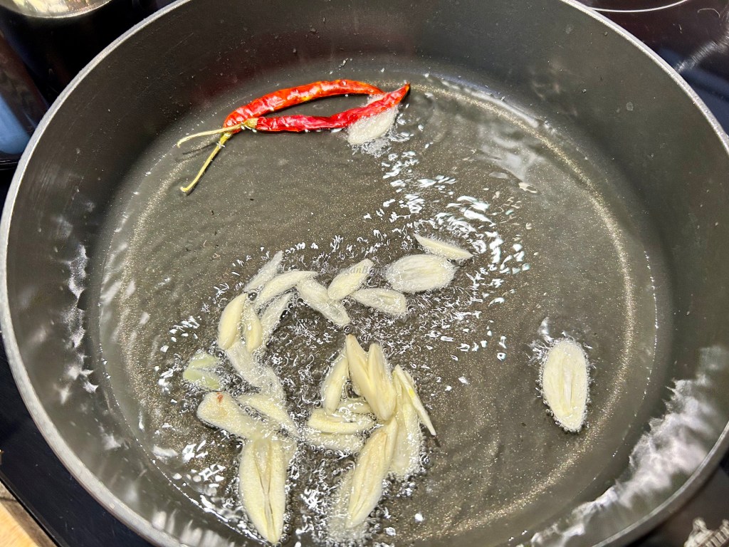 As usual, we need a few simple ingredients for this water spinach stir fry recipe – Onion, garlic, chili (both green and dry), salt and oil. Some like to cook this with shrimp, but today I am sharing the most basic recipe without shrimp that my mother used to make.