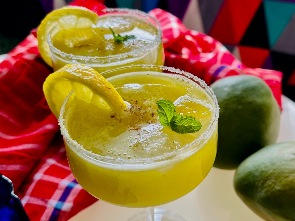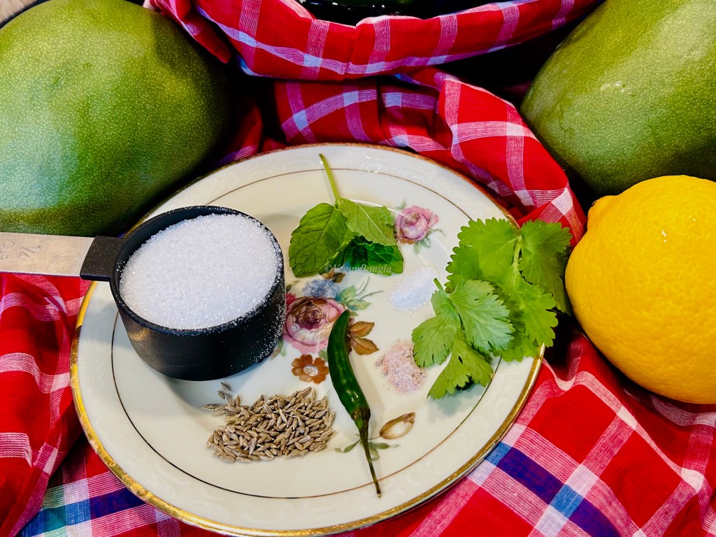 | Ingredients: Green Mango – 1 big (from any supermarket) Chili – 1 piece Sugar – 1/4th Cup or to taste Pink salt – 1/4 tsp Salt-1/4 tsp Fresh Coriander – to taste Cumin seed- 1/4tsp Lemon – half Mint leaves Lemon slice Ice to decorate |