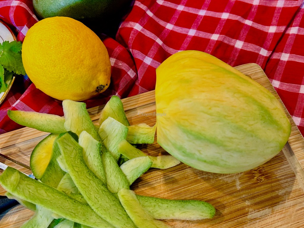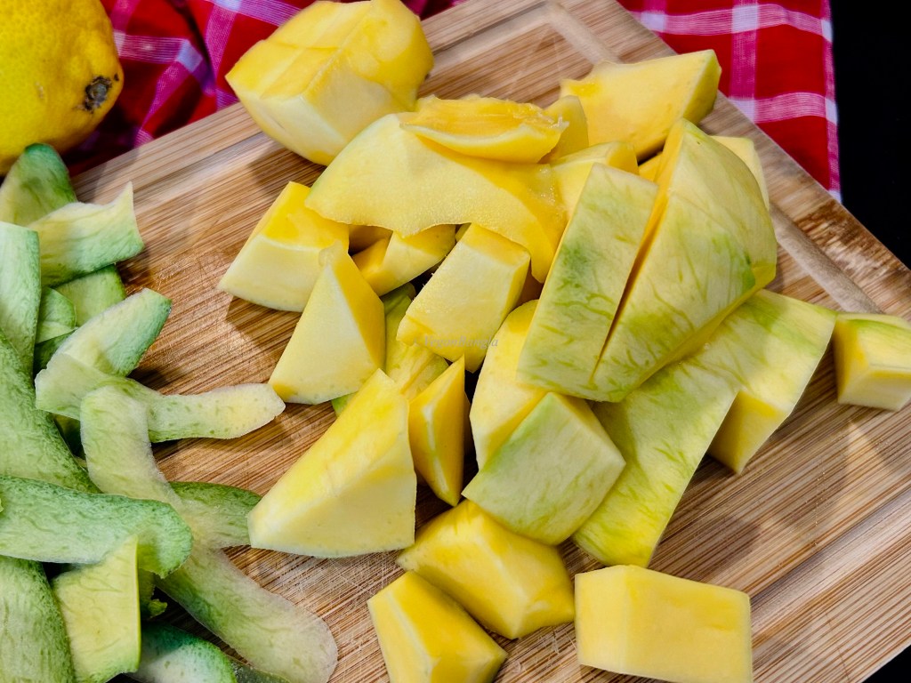 First to peel off the mango skin and cut into smaller pieces. As you can see in the photo, mango is slightly yellow. It will give a nice yellowish tint to the mocktail but it doesn’t make the mocktail sweet. You can take 100% green mango but then you need to adjust the sugar amount.