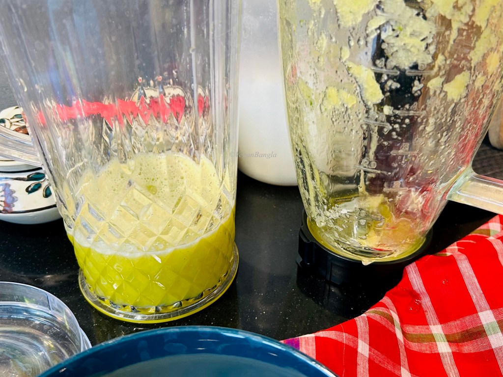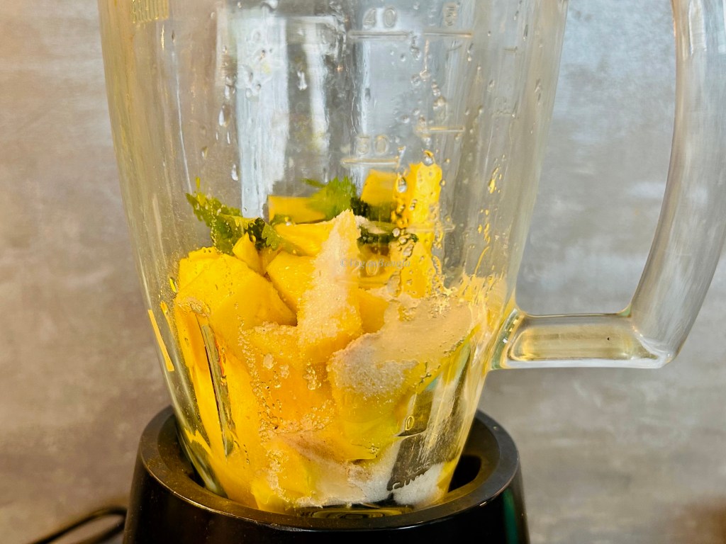 After dicing mango in small pieces, I added them in a juicer/blender jar with all other ingredients – sugar, chili, salt coriander leaves and lemon juice.