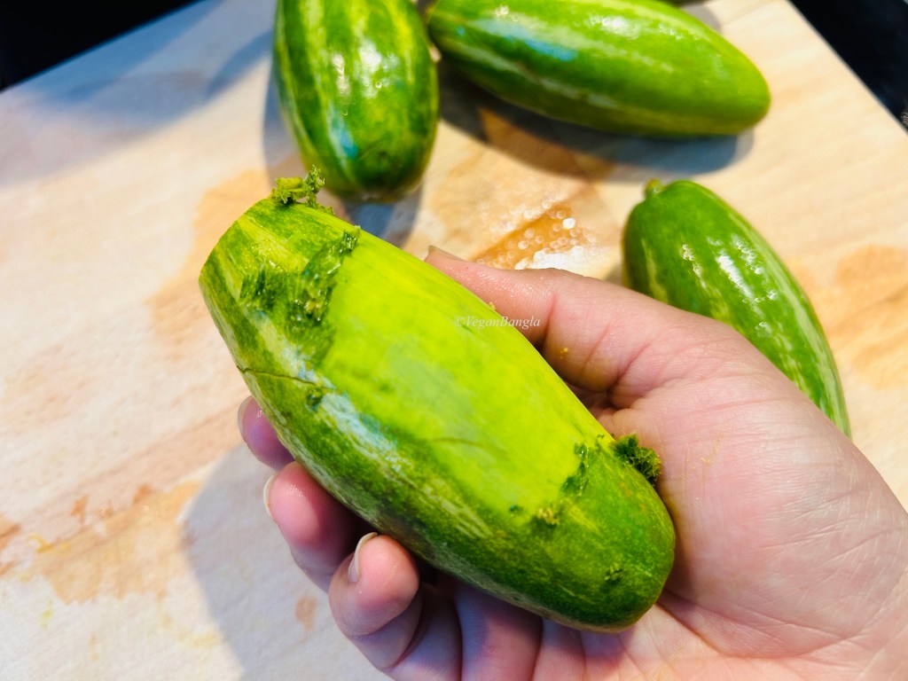 Meanwhile I am showing how to prepare potol. Potol has a very thin layer which if we remove by peeling, we loose half of the vegetable. So the best way to remove the skin is to scrape with sharp side of knife and remove the striped green skin. Also don’t forget to remove the both ‘pointy’ side of Pointed gourd.