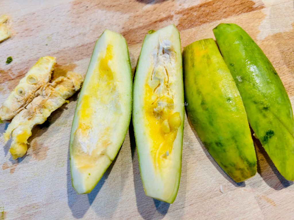 Now, after scraping the skin, if you cut the potol in half, you will see the seeds. Some seeds are soft but when the flesh inside is bit yellowish, it means the seeds are hard and not palatable. So I removed the hard seeds with a help of spoon.