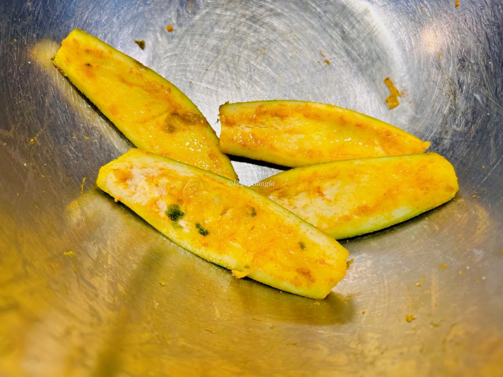 | Ingredients: Potol/pointed gourds- 4 medium pieces Tumeric powder – 1/2 tsp Salt – to taste Vegetable oil – to fry |
