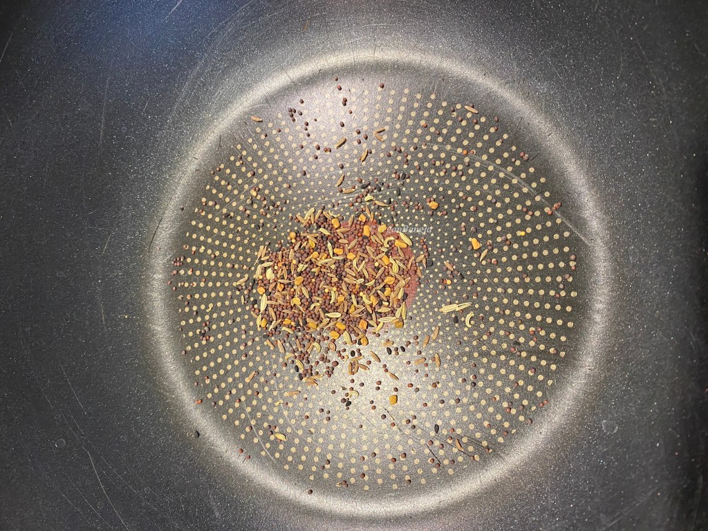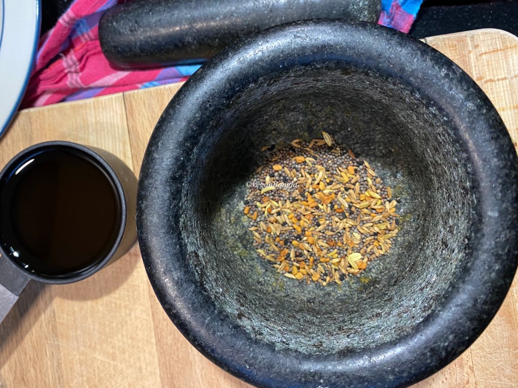 At first, I took a big deep pan and slightly toasted paach phoron. Then I pounded them in a mortar pestle coarsely and set them aside.