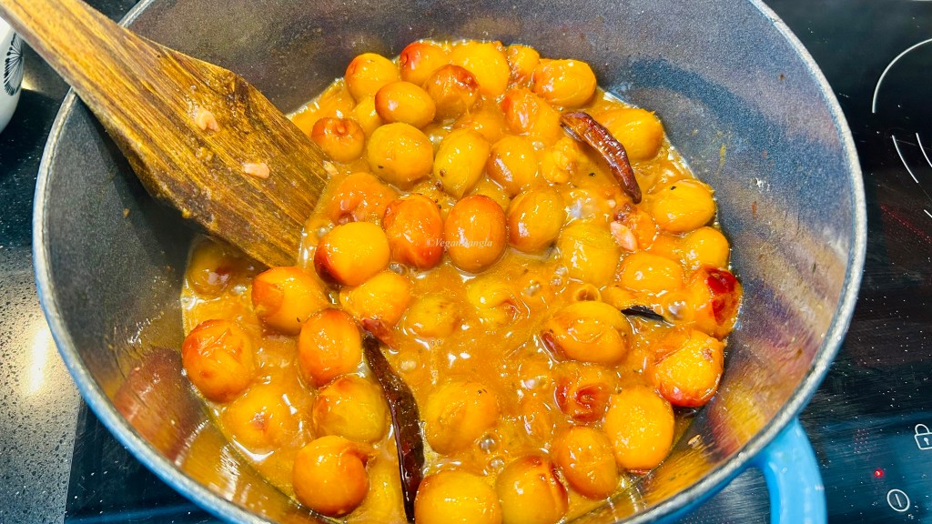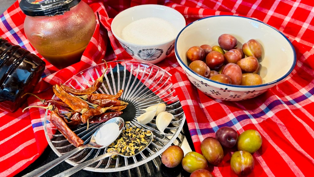 | Ingredients: 750 kilo of Victoria plum, preferably unripe Spice and Condiments: 150ml mustard oil 1 tsp Paach Phoron 150-200g Sugar (according to your taste) 1 tsp fine Salt 1 tsp Chili flakes 2-3 cloves of Garlic 1 tsp of tamarind sauce 2-3 Dry red Chili |