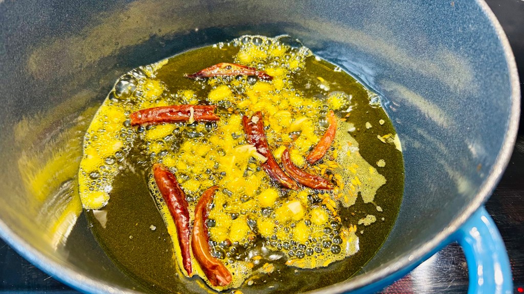 In the same wok, I added 200ml of mustard oil and heat in a medium temperature. Then I added some whole paach phoron, dry chilies and crushed garlic.