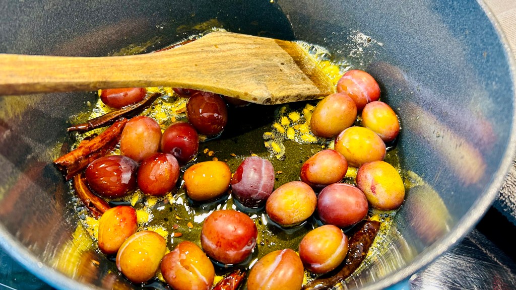 When garlic and chili starts to release flavour, I added the plums. I washed them beforehand and pat dried on towel, so there are no traces of water left.