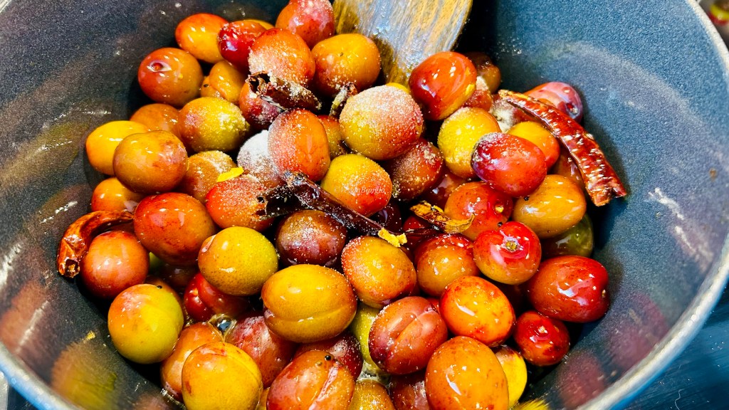 The plums are starting to get softened. It would be faster if the seeds were taken out, but I was too lazy to do that.