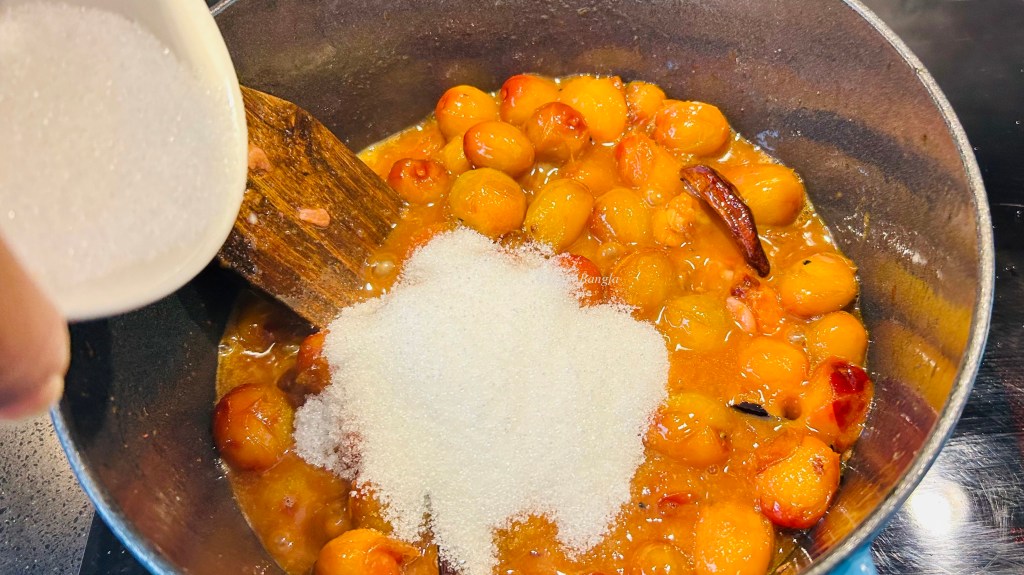 When plums were half cooked and softened, I added sugar. The amount of sugar depends on how sweet the plums already are and how sweet you want the pickle to be. In my case, I added almost 1/3 cup of sugar. But you can always taste before adding sugar.