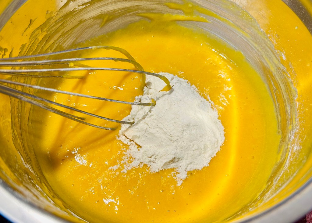 | Ingredients: Palm pulp – 250g (1 cup) Sugar – 110g (or according to your taste) (1/2 cup) Rice flour – 170g (3/4 cup) Plain wheat flour – 115g (1/2 cup) Baking powder – 1/2 tsp Salt – a pinch coconut flakes – optional oil – 1/4 cup |