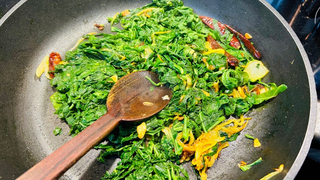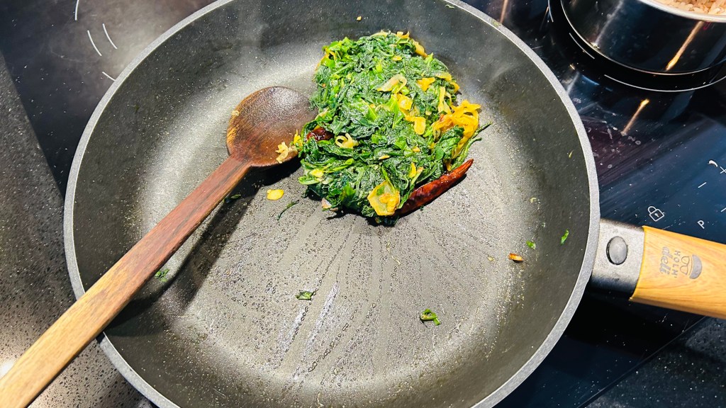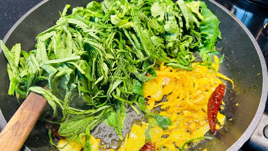 I added the chopped leaves to the pan. You need to stir carefully in a low temperature. The volume of the leaves might look daunting, but within few minutes the leaves will shrunk in volume and will be easy to handle.