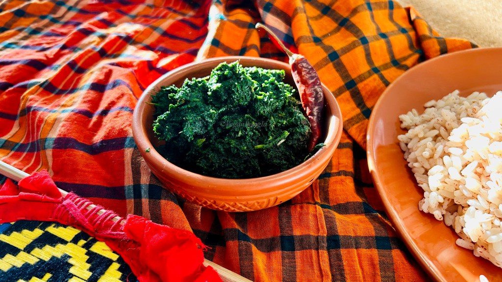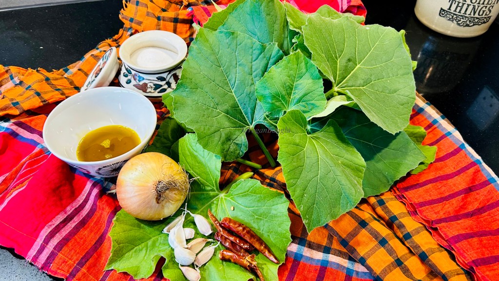 | Ingredients: Lau Pata/ Bottle Gourd Leaves – 25-30 pieces Onion- 1 medium Garlic- 3-4 cloves Dry red chili- 3/4 pieces Mustard Oil Salt |